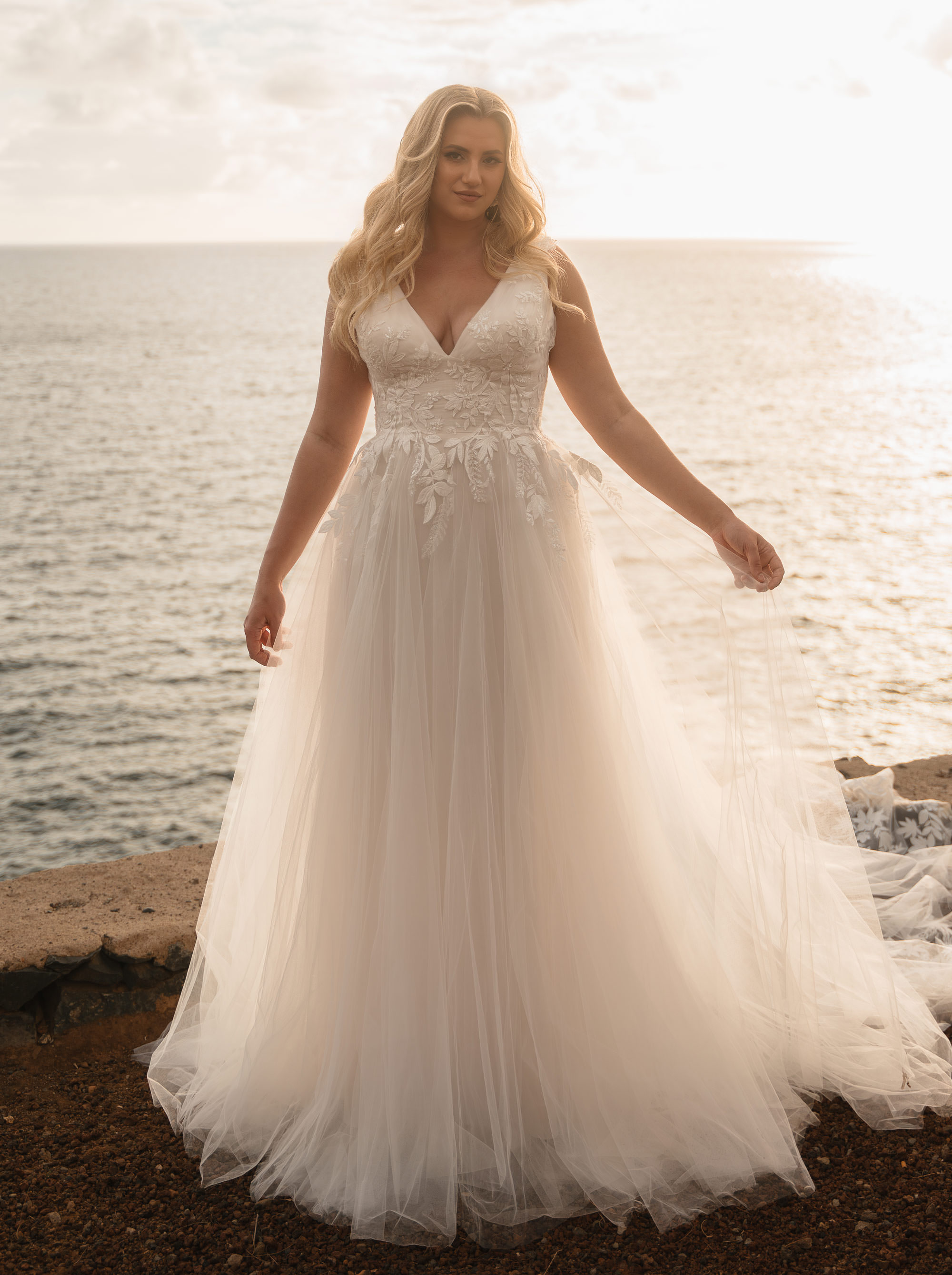 Als Spezialist für kurvige Bräute bieten wir Dir eine wunderschöne Auswahl an Hochzeitskleidern in größeren Größen (44-60+). Wir freuen uns so sehr auf Dich, um mit Dir gemeinsam mit viel Herz und Leidenschaft dein Plus Size Traumkleid zu finden.